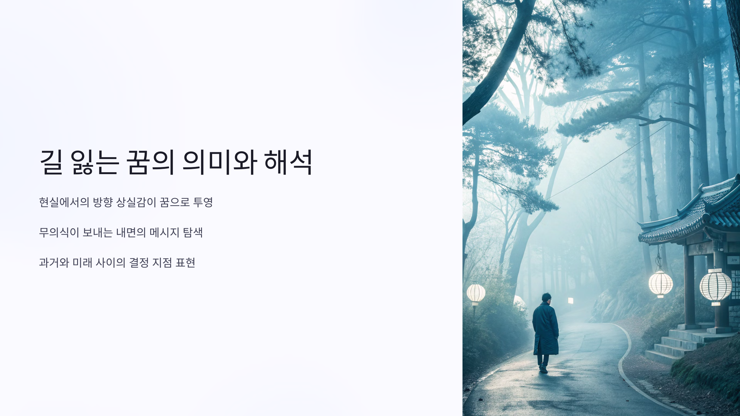 특히 어떤 선택의 순간, 인생의 갈림길 앞에 섰을 때 이런 꿈을 자주 꾸게 되죠. "이 길이 맞을까?", "나는 어디로 가고 있지?"라는 마음속 질문이 무의식 속에서 꿈으로 나타나는 거예요. 이 꿈에는 내 내면의 방향성과 심리 상태가 아주 선명하게 담겨 있어요.