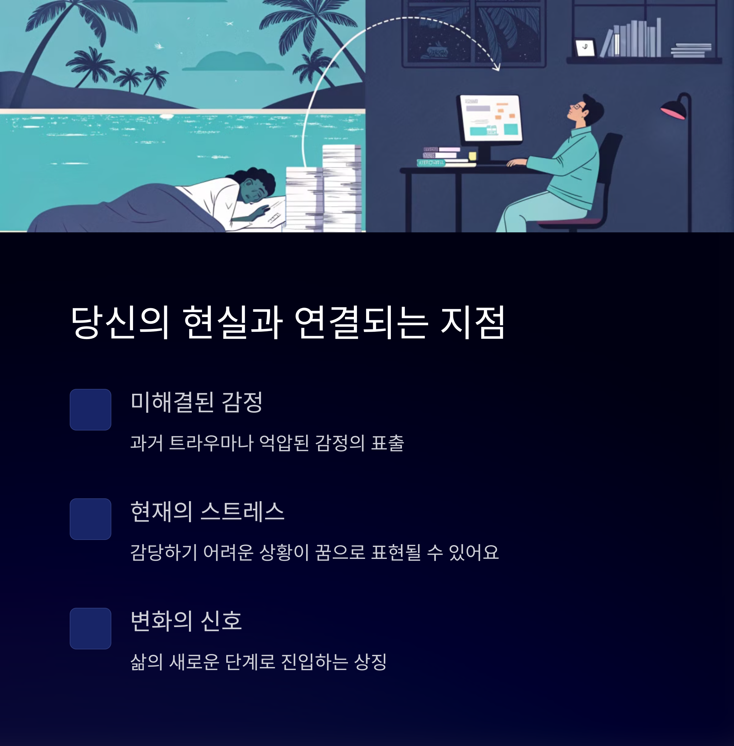 또 실제로 과거에 익사 공포, 수영 트라우마가 있는 사람이라면, 꿈에서 반복적으로 나타날 수도 있어요. 이럴 땐 감정 정리를 위한 일기 쓰기나 상담이 도움이 될 수 있어요.