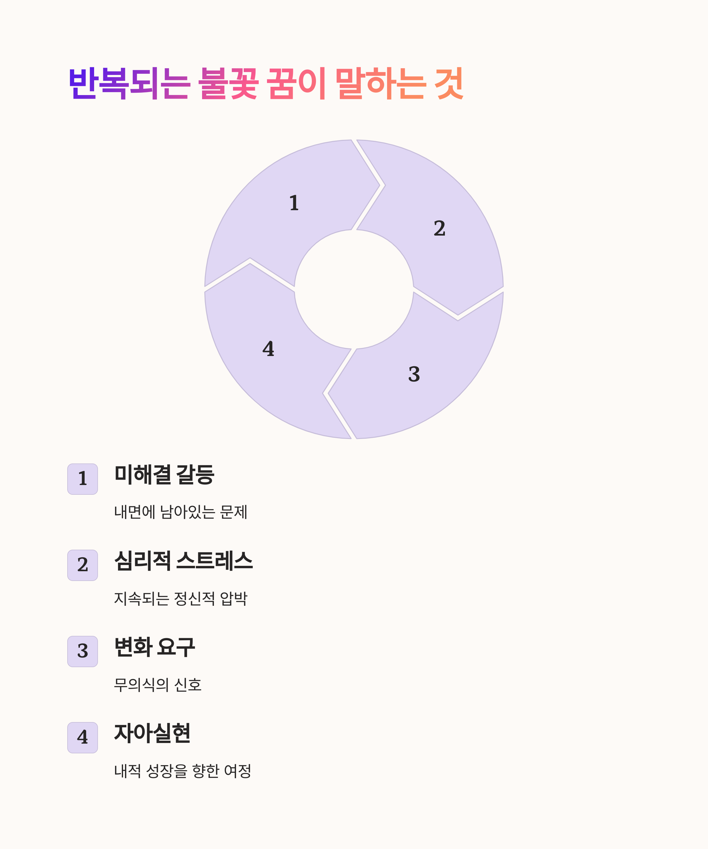 반복되는 불꿈은 나의 무의식이 보내는 경고일 수 있어요. 심리적으로 과부하가 걸렸다는 신호이기도 하죠. 이럴 때는 전문가 상담이나 감정 코칭을 받아보는 것도 도움이 될 수 있어요.