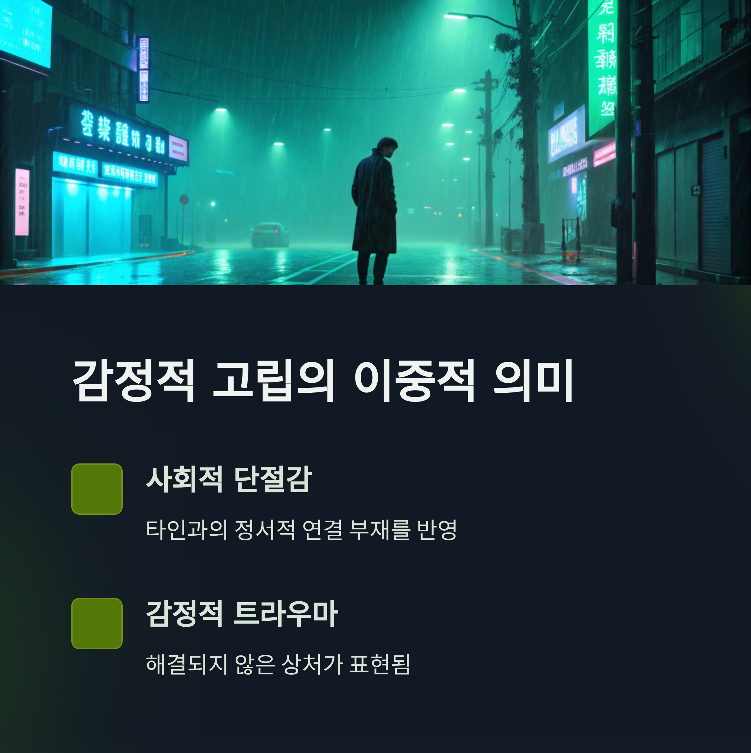 | 혼자 비 맞으며 걷는 장면 | 외로움, 감정 억제 |