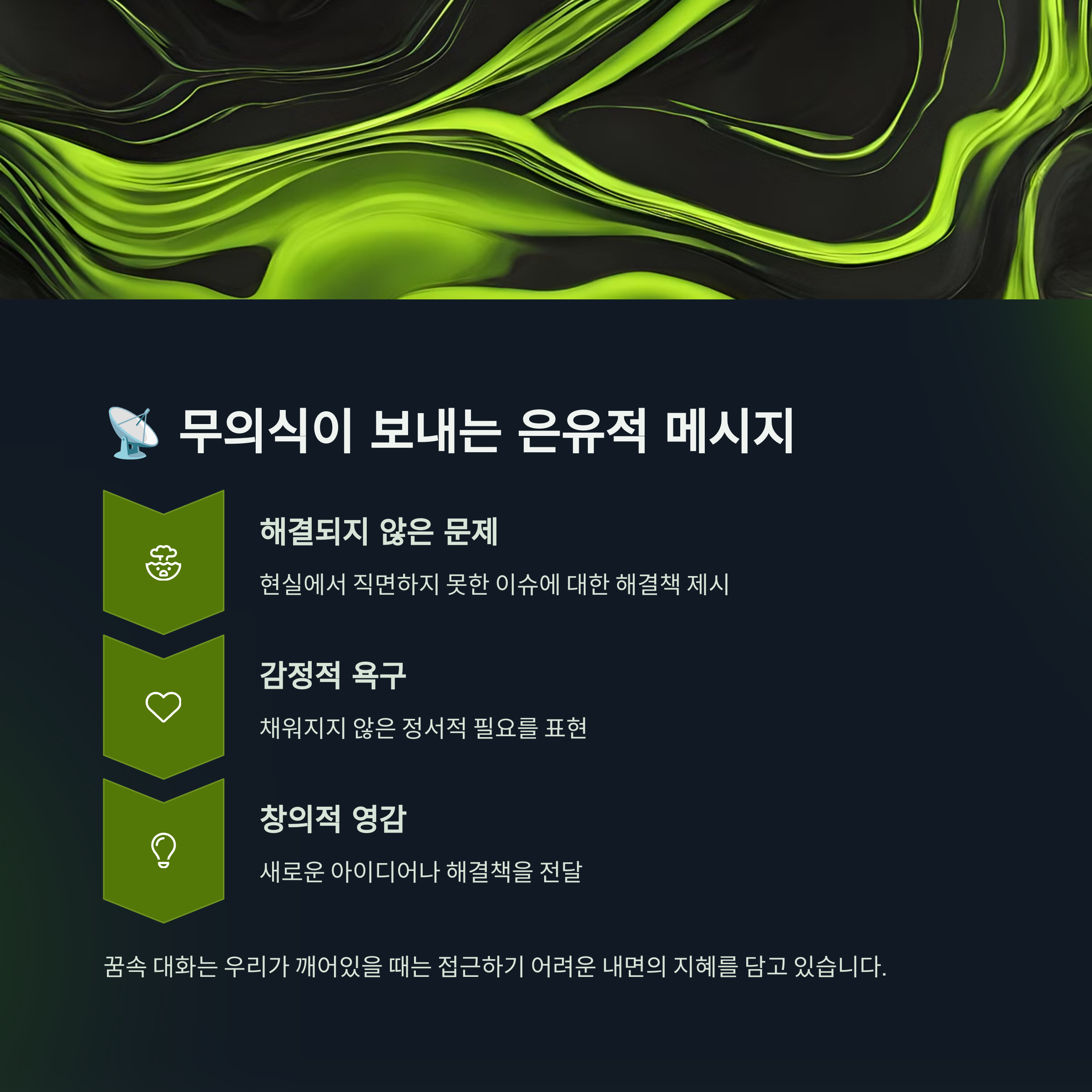 무의식은 말이 아닌 ‘상징’을 사용해요. 그 상징과 말이 만난 순간, 우리는 내면의 진실을 잠깐 마주한 거예요. 👤