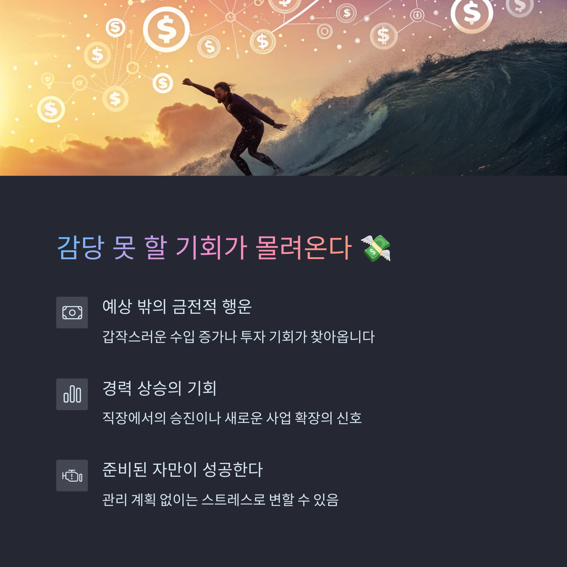| 파도에 올라탐 | 기회 수용과 활용 | 수익 창출 가능성 |