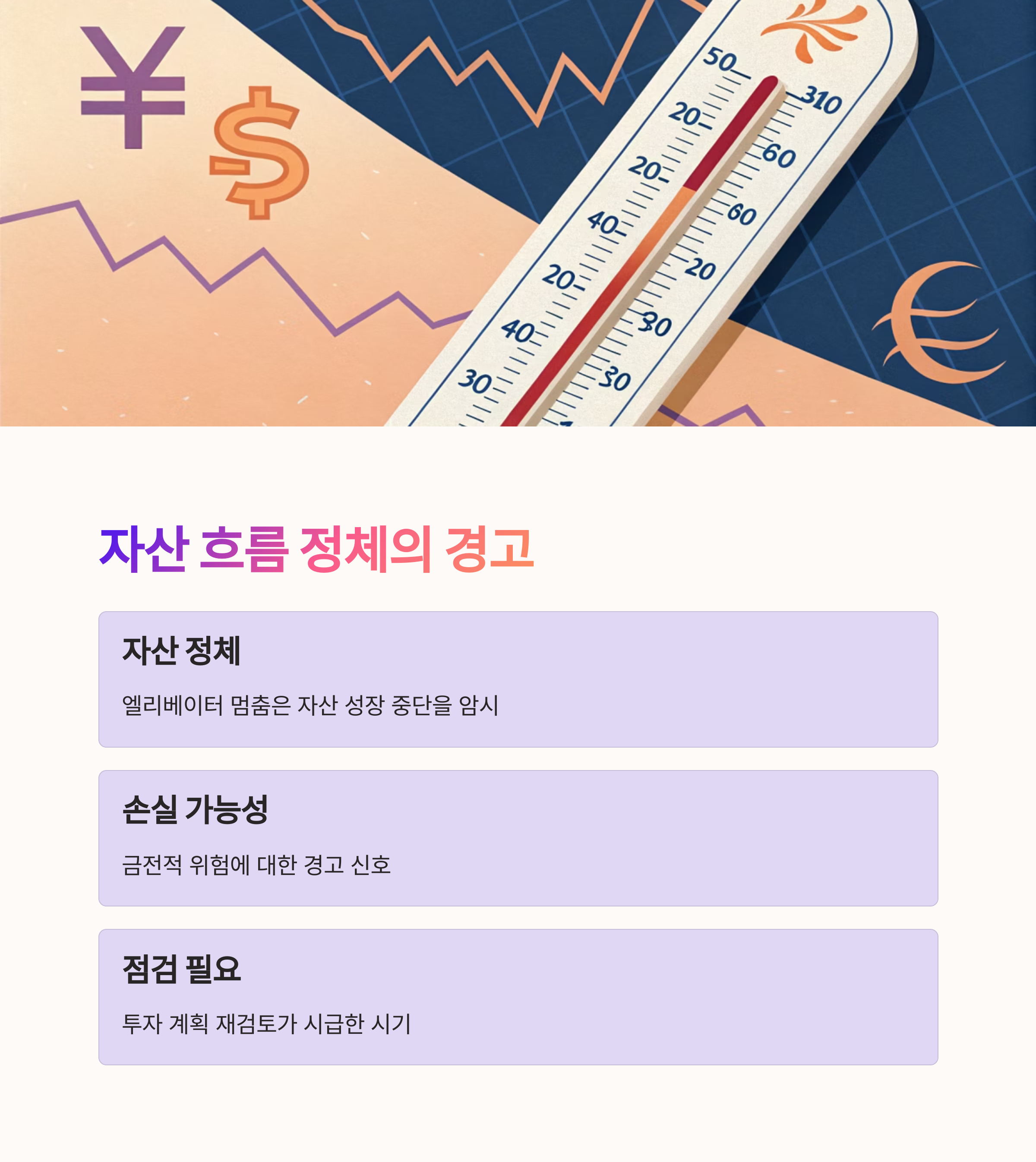 엘리베이터가 멈추는 꿈은 현실의 **자산 흐름이 정체되고 있다**는 신호일 수 있어요. 급여가 늦어지거나, 투자 수익이 줄어들거나, 사업 흐름이 주춤할 때 이런 꿈을 꿀 확률이 높아져요.