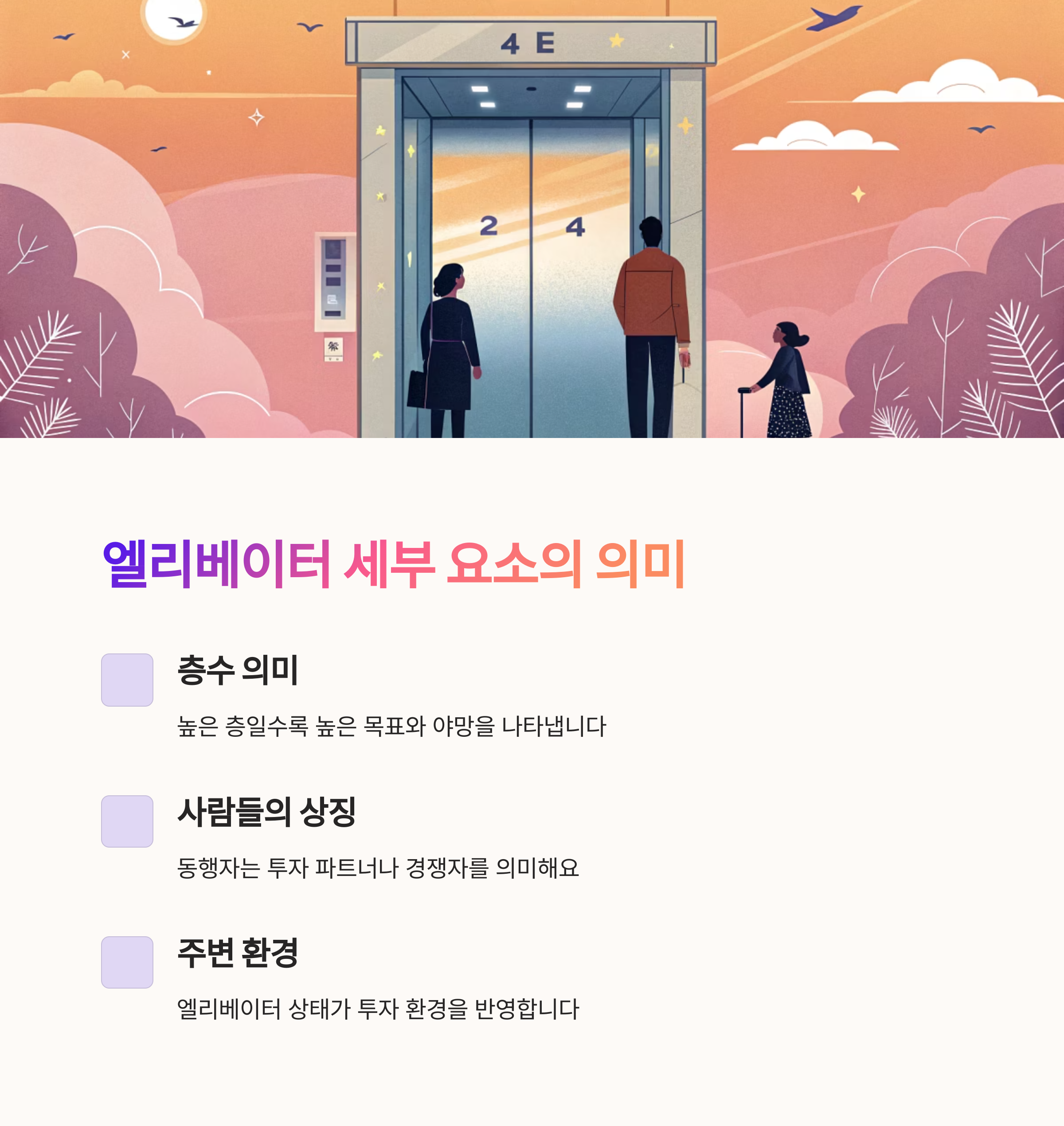 엘리베이터 안에 누가 함께 있었는지도 중요해요. 혼자였다면 자기 성찰, 타인과 함께였다면 관계 속에서의 갈등, 압박, 또는 경쟁을 뜻할 수 있어요. 특히 상사나 모르는 사람이 함께 있던 경우, 외부 요인이 자산 흐름에 영향을 주고 있다는 신호일 수 있답니다.
