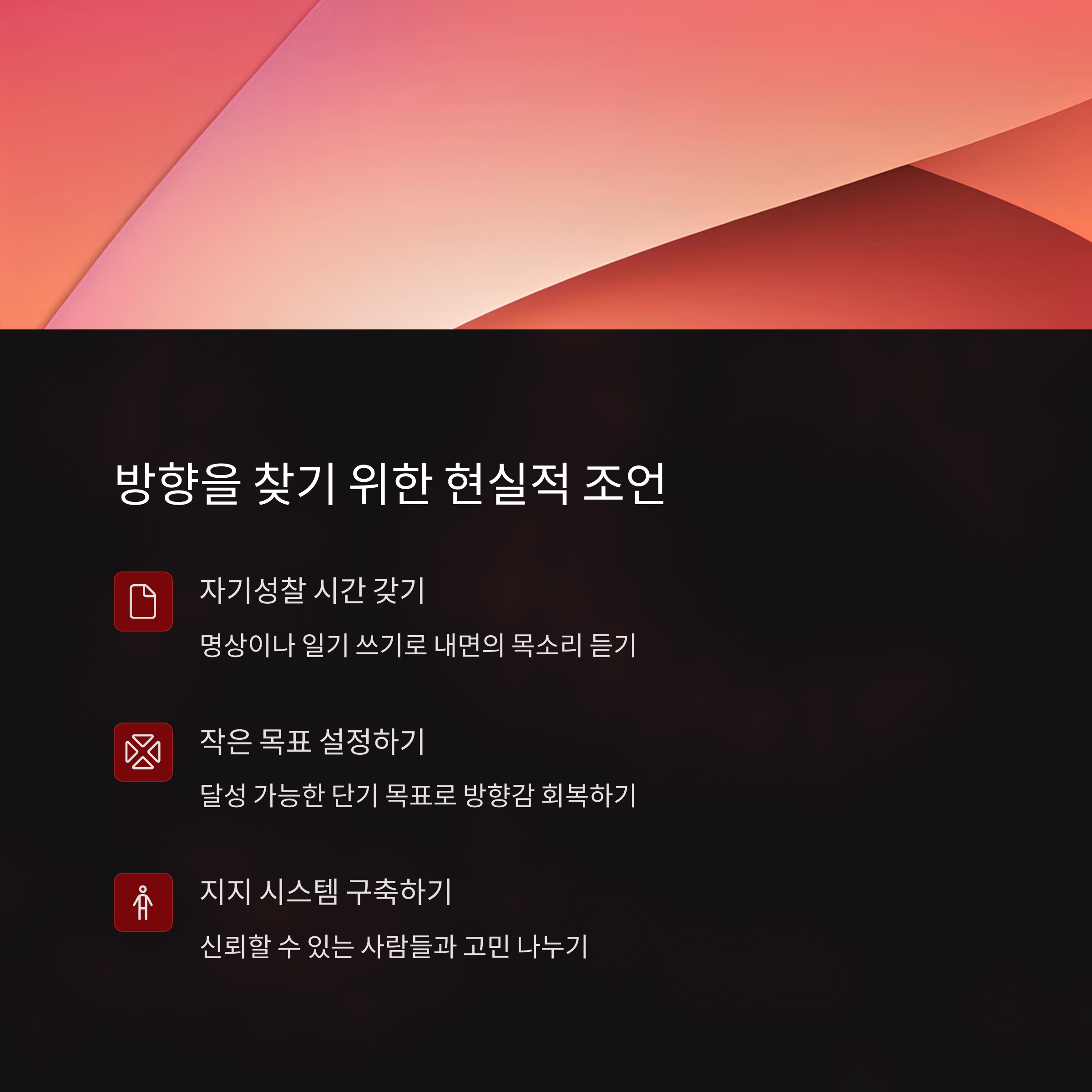 이럴 때는 선택을 서두르기보다 지금 멈춰서 나의 감정, 나의 피로도, 나의 필요를 돌아보는 게 먼저예요. 그게 진짜 방향의 출발점이에요.