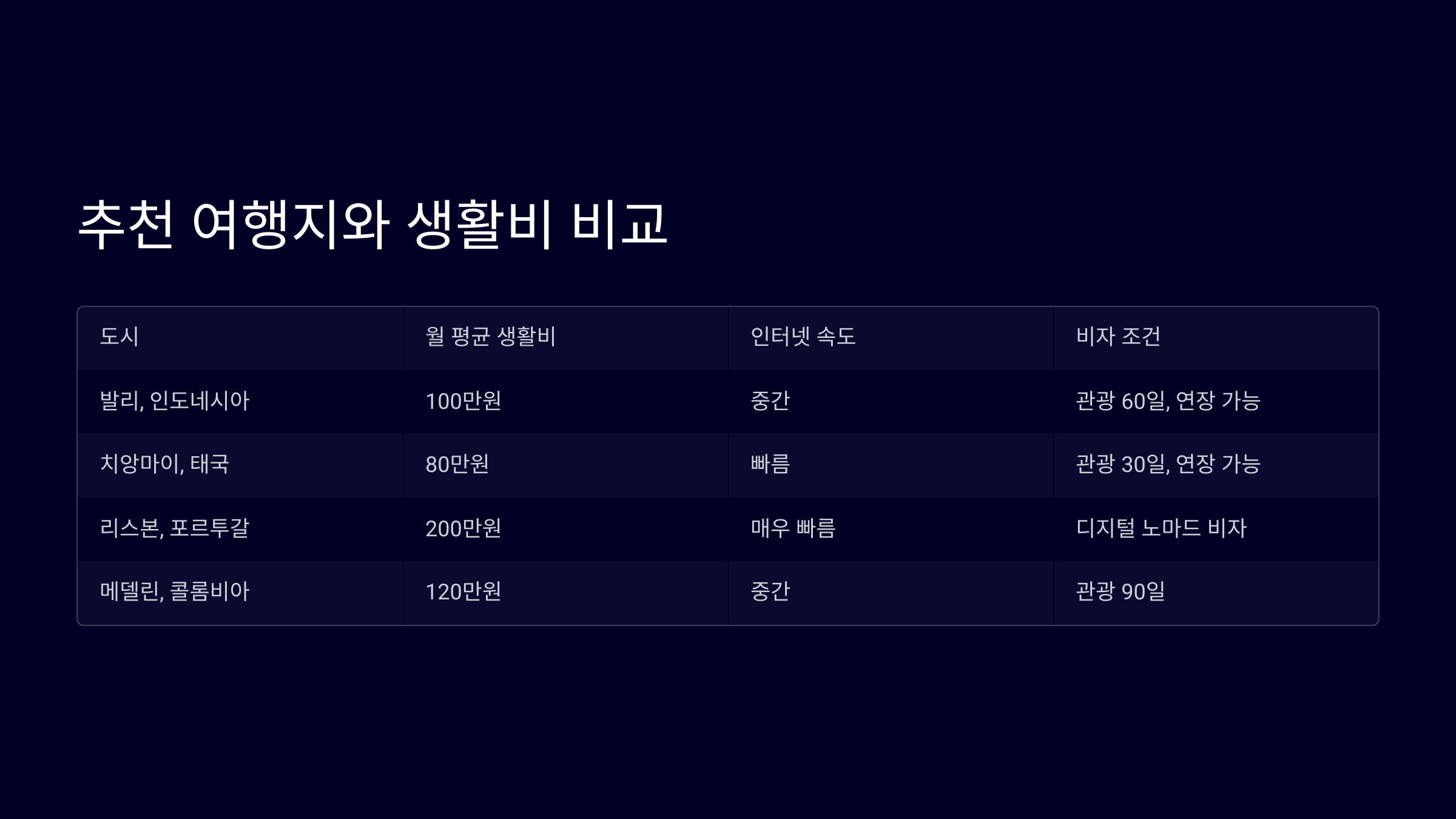 각 도시마다 장단점이 있어요. 인터넷 환경이 좋은 곳, 물가가 저렴한 곳, 커뮤니티가 활발한 곳 등을 고려해서 자신에게 맞는 도시를 선택하는 것이 중요해요!