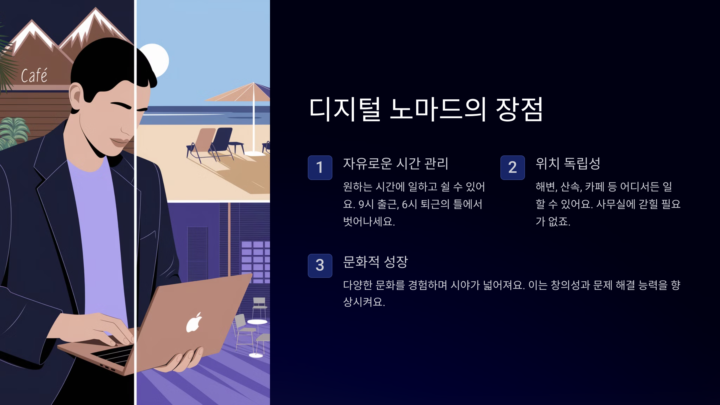 디지털 노마드는 인터넷과 노트북만 있으면 세계 어디서든 일하며 살아가는 사람들을 의미해요. 사무실에 얽매이지 않고 카페, 코워킹 스페이스, 심지어는 해변에서도 일을 할 수 있는 삶이죠.