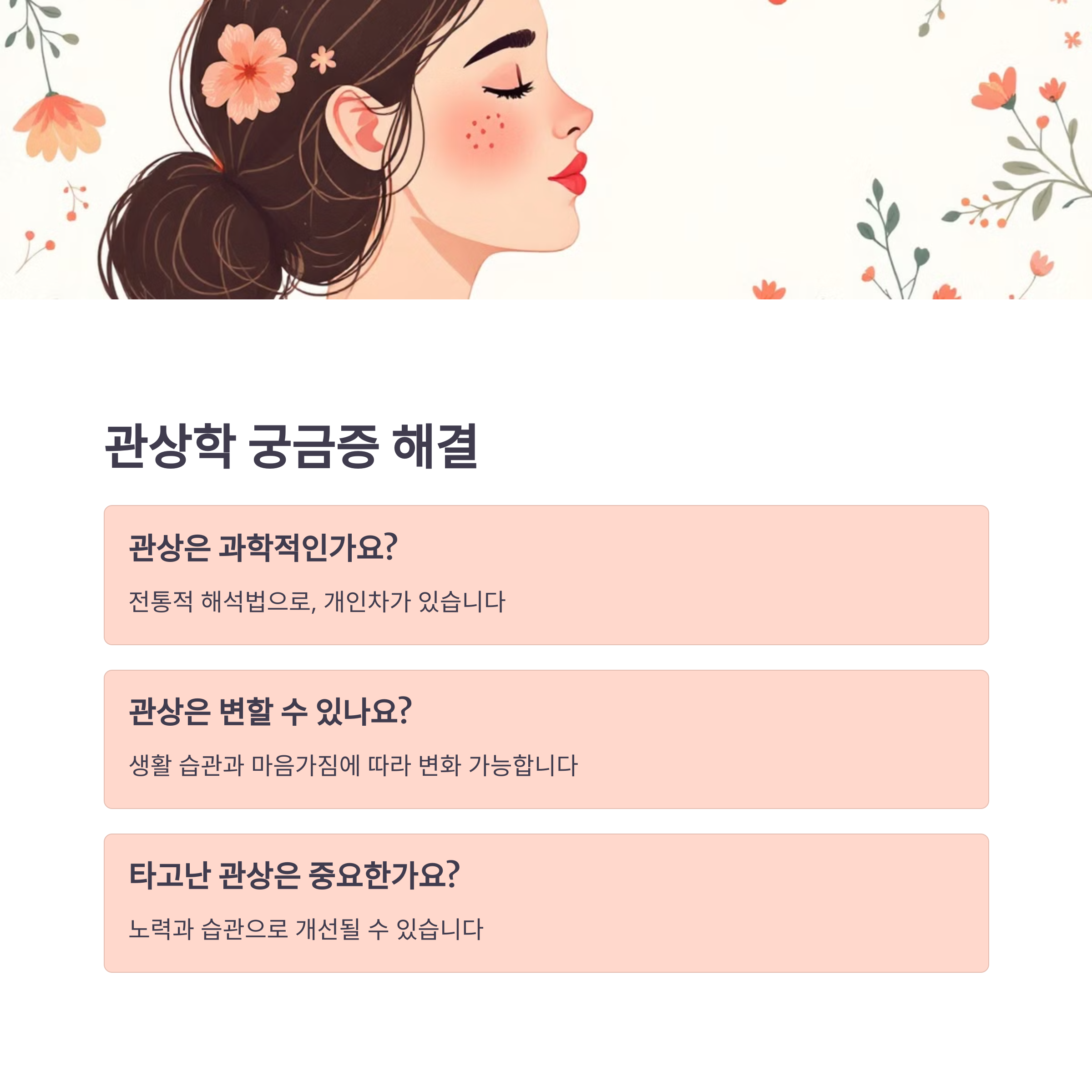 A1. 관상은 **타고난 성격과 기질을 반영하는 요소일 뿐, 운명을 결정짓는 것은 아니에요.** 하지만 좋은 인상을 유지하고 긍정적인 태도를 가지면 더 나은 기운을 얻을 수 있어요. 😊